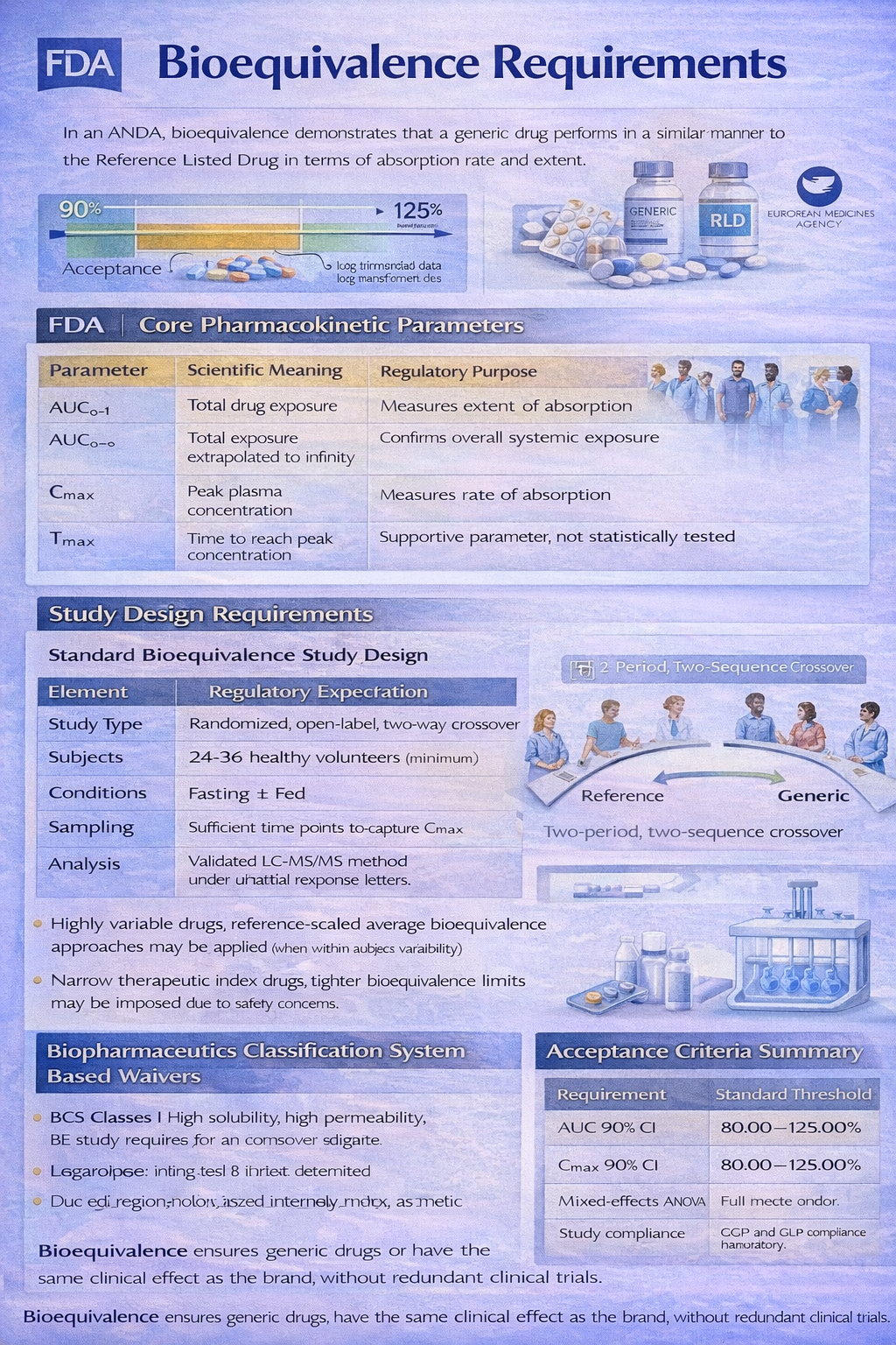 Bioequivalence Requirements form the scientific backbone of an Abbreviated New Drug Application submitted to the U.S. Food and Drug Administration under Section 505(j) of the Federal Food, Drug, and Cosmetic Act. The objective of bioequivalence is to demonstrate that the proposed generic product performs in the same manner as the Reference Listed Drug in terms of rate and extent of absorption. Unlike a New Drug Application, where full clinical efficacy and safety studies are required, an ANDA relies primarily on comparative pharmacokinetic evidence to establish therapeutic equivalence.