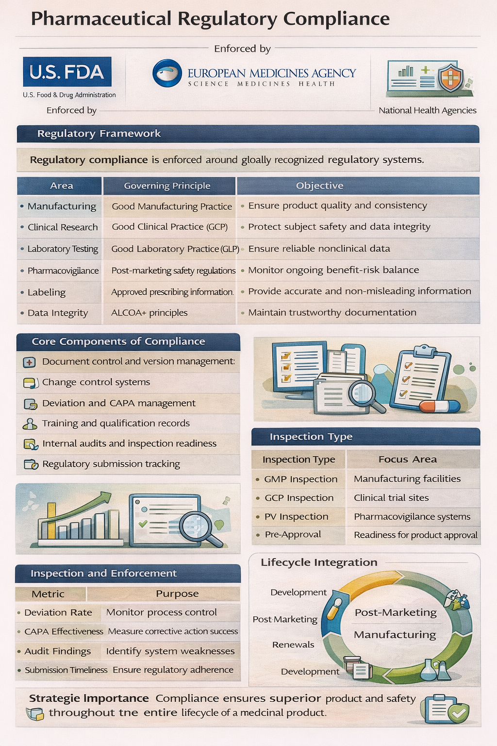 Pharmaceutical compliance is structured around globally recognized regulatory systems and standards.