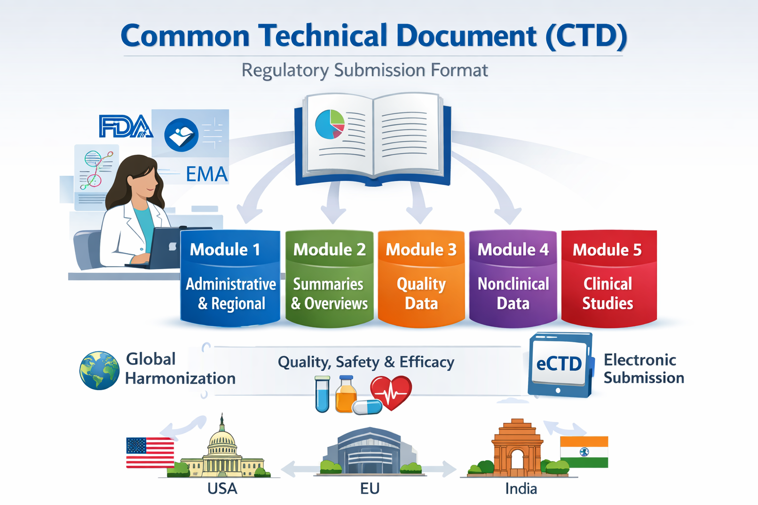 The Common Technical Document, or CTD, is the globally accepted format for regulatory submissions of pharmaceuticals, biologics, and biosimilars. Developed under the International Council for Harmonisation (ICH), the CTD was introduced to harmonize the submission of quality, safety, and efficacy data across regulatory authorities such as the US FDA, EMA, Health Canada, TGA, and CDSCO. Prior to the CTD, each regulatory agency required a unique submission format, which resulted in redundancy, inefficiencies, delays, and increased risk of errors. The CTD allows a single dossier to be submitted to multiple regions with minimal modifications, ensuring faster and more consistent regulatory review. It is designed to support both innovator and generic products, facilitating lifecycle management, including post-approval variations, renewals, and safety updates. For Regulatory Affairs professionals, the CTD provides a structured framework to organize complex data in a manner that meets global regulatory standards, improves cross-functional collaboration, and enhances communication with agencies.