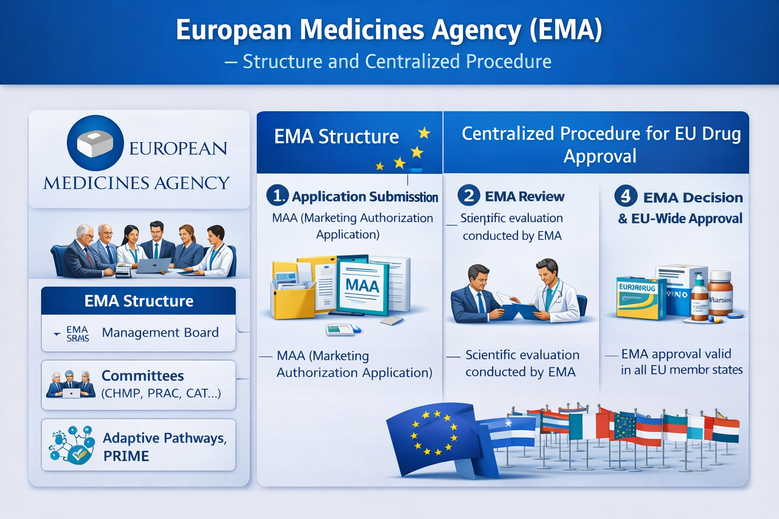 The European Medicines Agency (EMA) is responsible for the scientific evaluation, supervision, and safety monitoring of medicines within the European Union. It operates through a network-based system that includes EMA scientific committees and the National Competent Authorities of EU Member States. This coordinated approach ensures harmonized regulatory standards and consistent oversight across Europe.