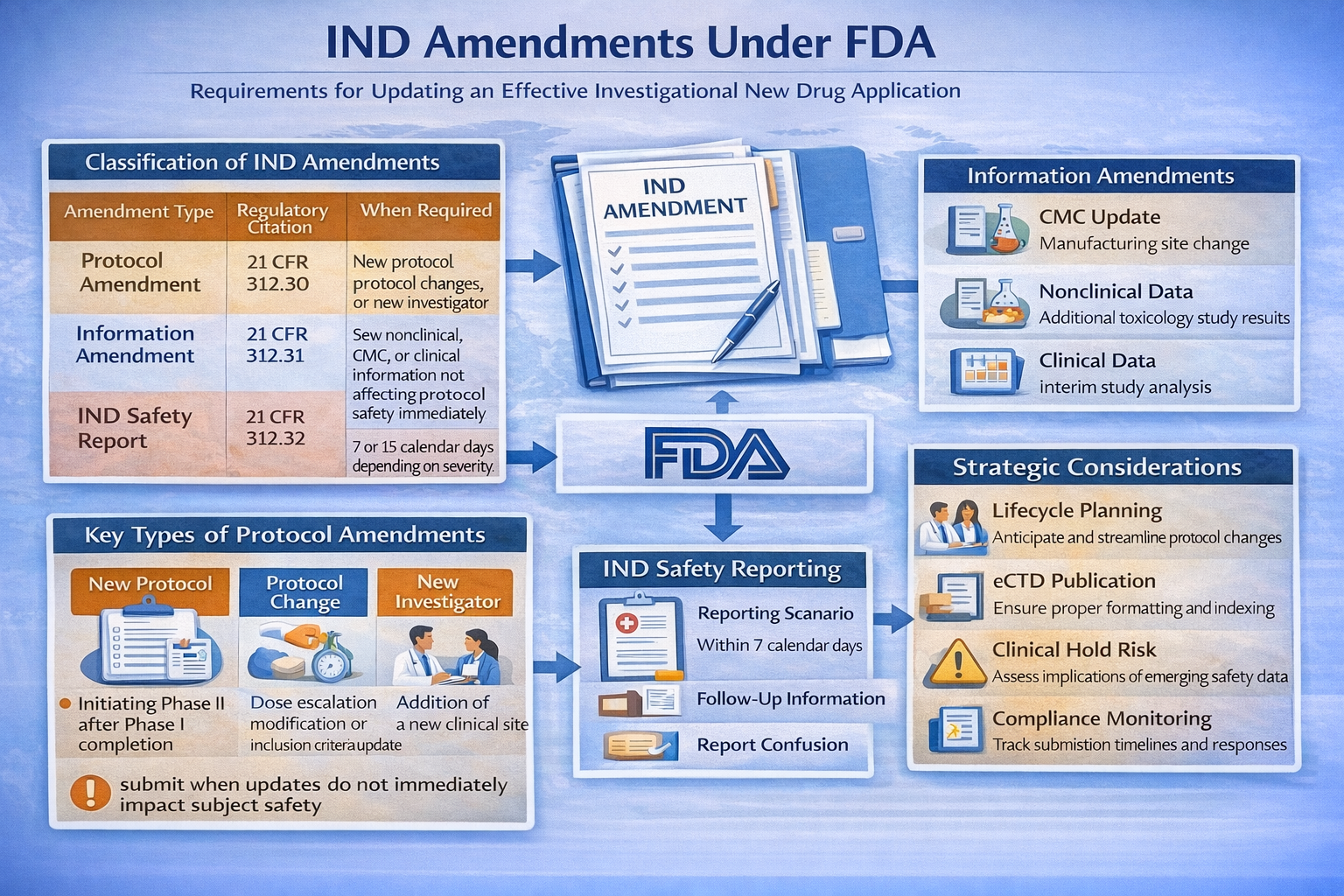 IND Amendments are formal submissions made to an active Investigational New Drug application to notify the FDA of changes or to provide new information during the clinical development lifecycle. Under 21 CFR 312.30 and 312.31, sponsors are legally obligated to maintain an updated IND. From a regulatory affairs perspective, amendments are not administrative formalities; they are controlled risk-management communications that ensure subject safety, product quality, and regulatory transparency throughout clinical development.