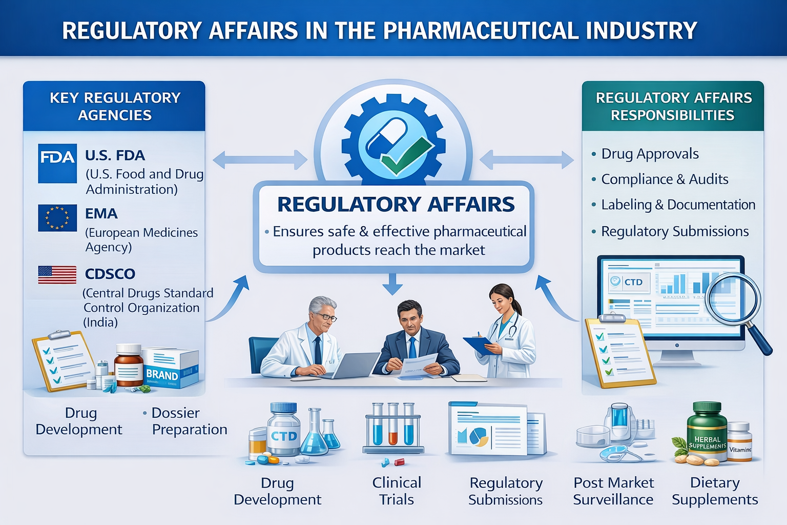 Regulatory Affairs (RA) is a critical function within the pharmaceutical, biotechnology, and medical device industries. It ensures that products are developed, manufactured, tested, approved, and marketed in accordance with applicable laws, regulations, and quality standards. The main objective of Regulatory Affairs is to protect public health by ensuring that medicines and medical products are safe, effective, and of high quality before they reach patients.