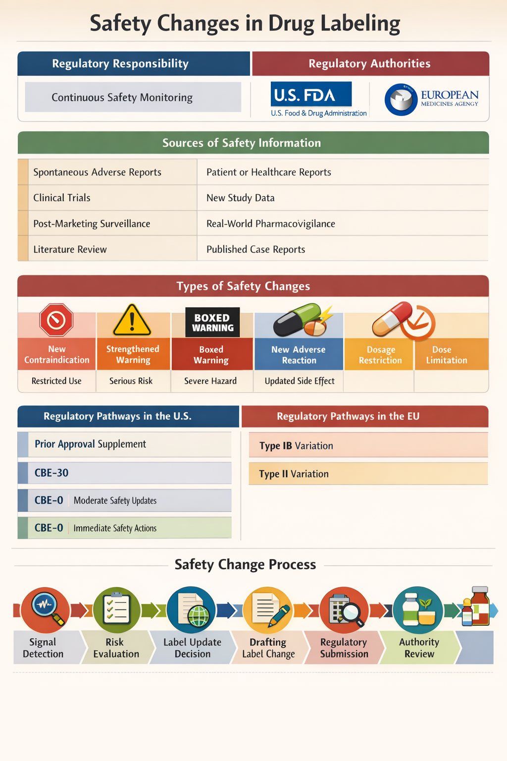 Safety Changes refer to regulatory updates made to product labeling when new risk information emerges after a medicine is approved. These changes are critical because they directly affect patient safety and the overall benefit–risk balance of the product. Safety changes can impact professional labeling such as USPI and SmPC, as well as patient-facing documents like PIL and Medication Guides.