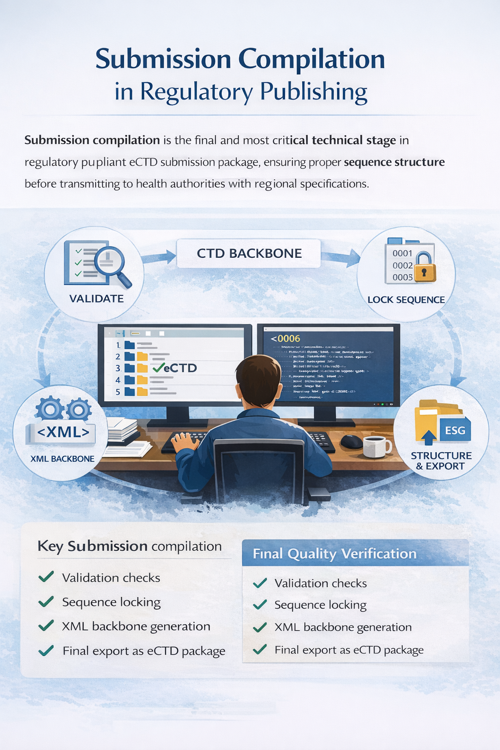 Submission compilation is the final and most critical technical stage in the regulatory publishing workflow. It is the process by which all validated, quality-checked, lifecycle-controlled documents are assembled into a finalized electronic sequence ready for transmission to regulatory authorities. This stage occurs after document preparation, bookmarking, hyperlinking, metadata entry, lifecycle assignment, XML backbone generation, and validation have been successfully completed.