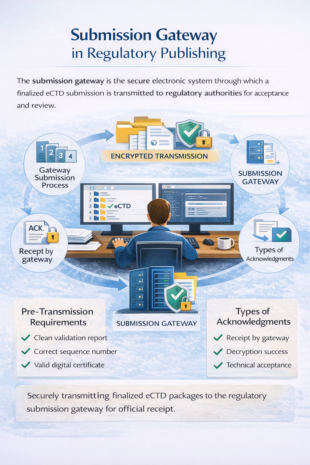 A Submission Gateway is a secure electronic platform used by regulatory authorities to receive eCTD and other electronic submissions from pharmaceutical companies. After successful validation and compilation, the finalized sequence is transmitted through the respective gateway where it undergoes encryption verification, authentication, and technical screening before entering the regulatory review process. The gateway acts as the official electronic entry point and confirms submission receipt through structured acknowledgment messages.