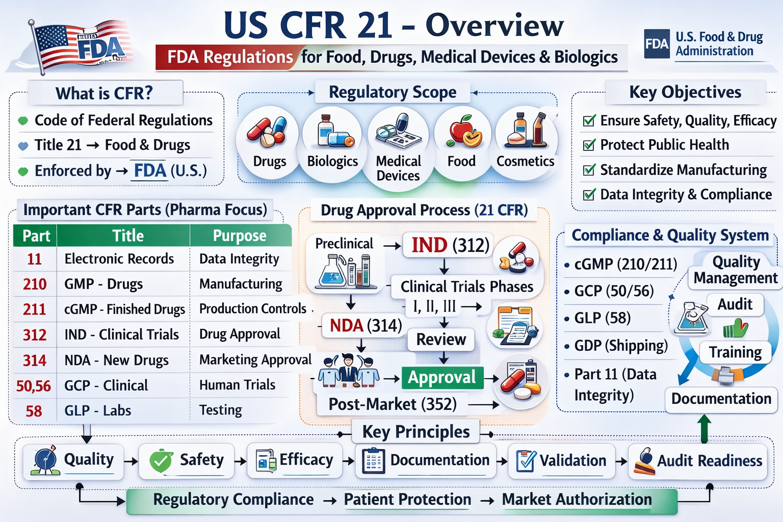 Title 21 of the Code of Federal Regulations (CFR) constitutes the primary set of rules governing food, drugs, biologics, medical devices, cosmetics, and tobacco products in the United States. These regulations are enforced by the U.S. Food and Drug Administration (FDA) and form the legal foundation for protecting public health. They define how regulated products must be developed, tested, manufactured, labeled, distributed, and monitored after approval. For professionals in pharmaceutical manufacturing, clinical research, quality assurance, and regulatory affairs, Title 21 is not merely a legal reference but a practical framework guiding daily operations. Understanding these regulations is essential to ensure that products are safe, effective, and compliant with federal standards.