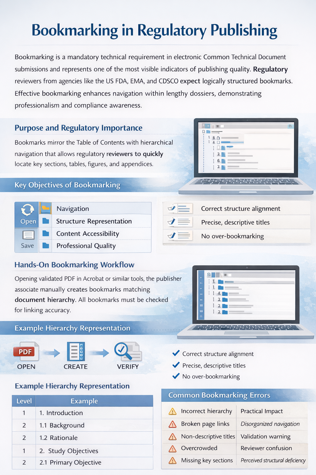 Bookmarking is a mandatory technical requirement in electronic Common Technical Document submissions and represents one of the most visible indicators of publishing quality. In regulatory publishing, bookmarking refers to the creation of a structured navigation panel within a PDF that reflects the logical hierarchy of the document. Regulatory reviewers from agencies such as the US FDA, EMA, and CDSCO rely heavily on bookmarks to navigate large dossiers efficiently. Poor bookmarking does not usually result in immediate rejection, but it creates validation warnings, reviewer frustration, and negative regulatory perception.