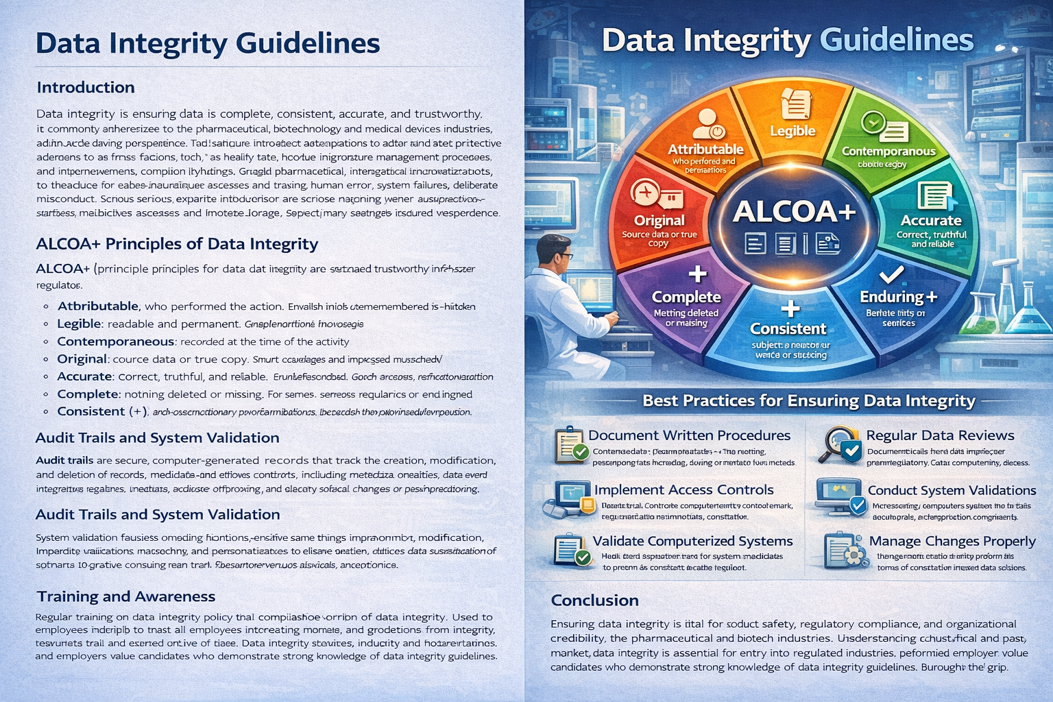 Data integrity is a cornerstone of regulatory compliance, product quality, and patient safety. By understanding regulatory expectations, lifecycle management, electronic system controls, documentation practices, and ethical responsibilities, professionals ensure that data remains complete, accurate, reliable, and inspection-ready throughout its lifecycle. Mastery of these concepts is essential for roles in regulatory affairs, quality assurance, clinical research, and manufacturing within the pharmaceutical and biotechnology sectors.
