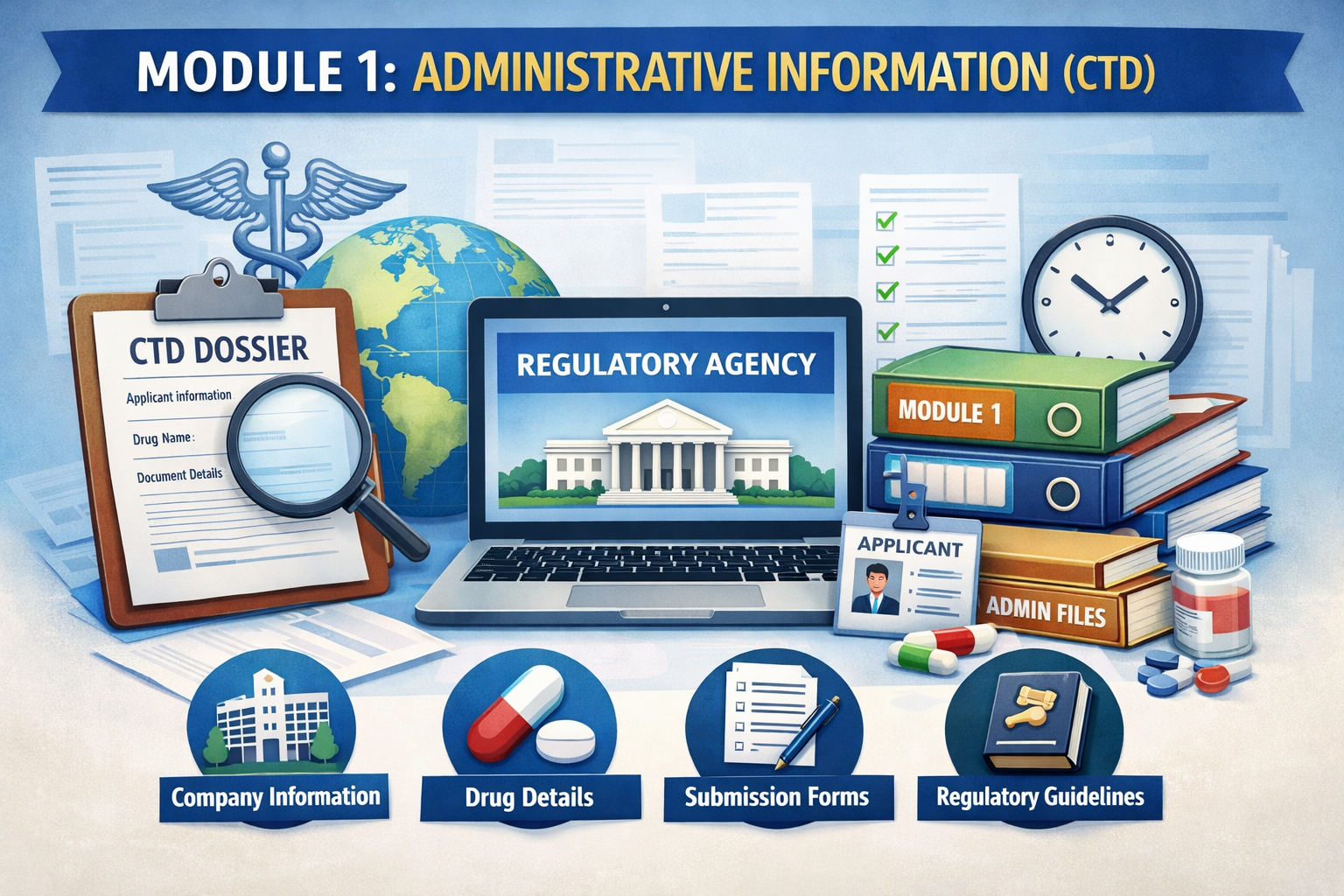 Module 1 of the Common Technical Document (CTD) serves as the administrative and regional section of the regulatory submission. Unlike Modules 2 through 5, which are harmonized globally under ICH guidelines, Module 1 is region-specific. Its purpose is to provide regulatory authorities with all administrative, procedural, and legal information required to accept, register, or review a product application. Module 1 forms the first impression of a submission, enabling reviewers to quickly identify the applicant, the product, the type of application, and compliance with regional regulations. Proper organization of Module 1 is crucial because any omission or error can delay the submission process, trigger additional queries, or even result in a rejection.