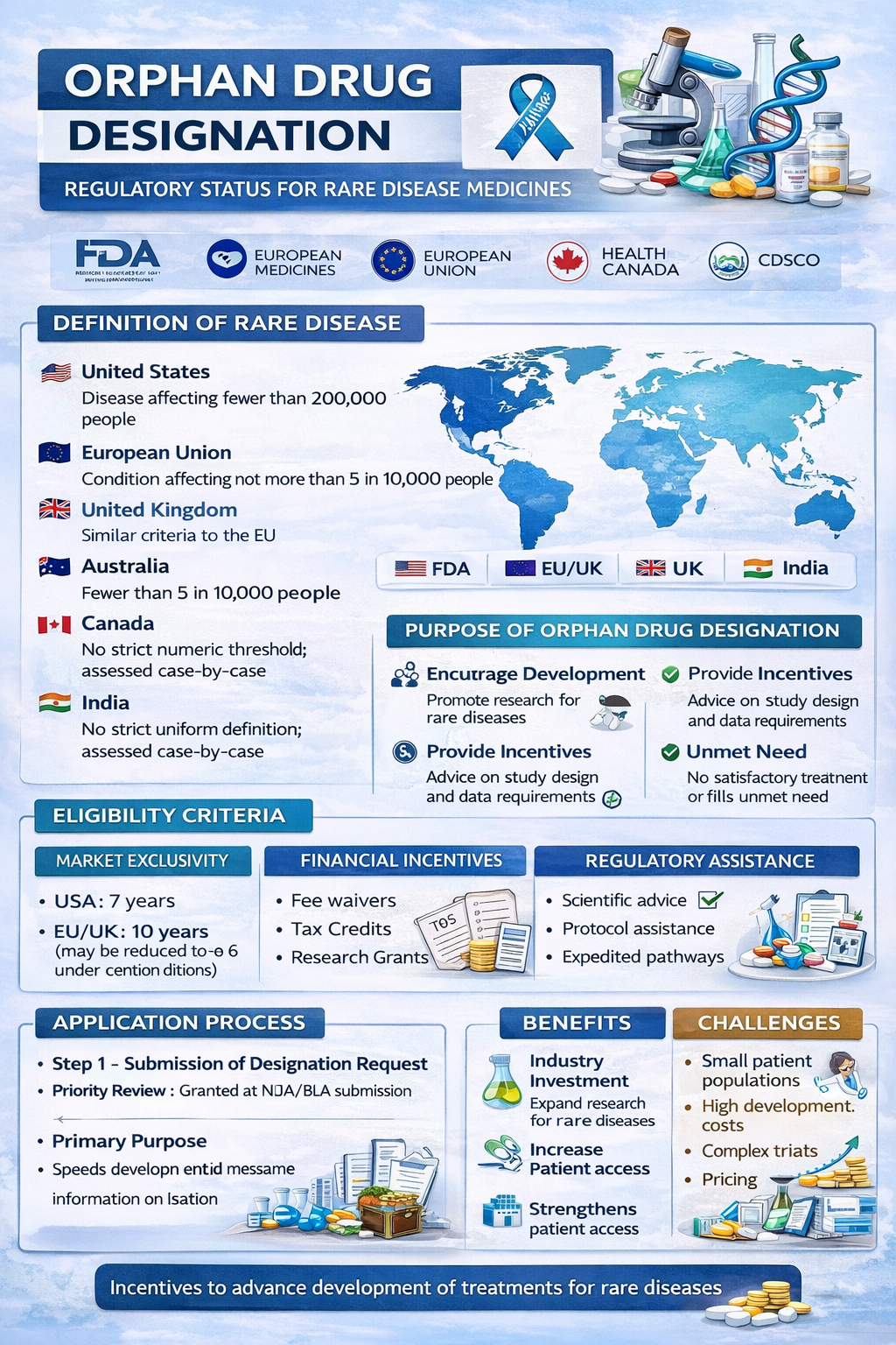 Orphan Drug Designation (ODD) is a special regulatory status granted to medicines intended for the treatment, prevention, or diagnosis of rare diseases. Because rare diseases affect small patient populations, commercial development is often financially challenging without regulatory incentives.