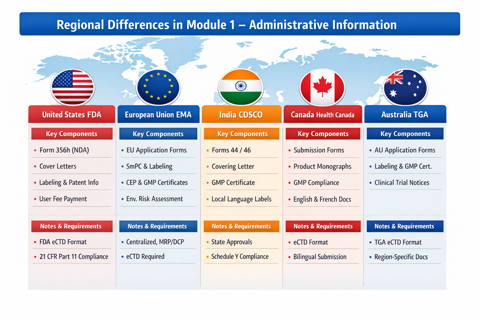 | Australia (TGA) | Application forms, cover letters, labeling, GMP certificate, clinical trial notifications (if applicable) | TGA requires region-specific forms even when dossier follows ICH CTD structure; eCTD mandatory for most submissions. |