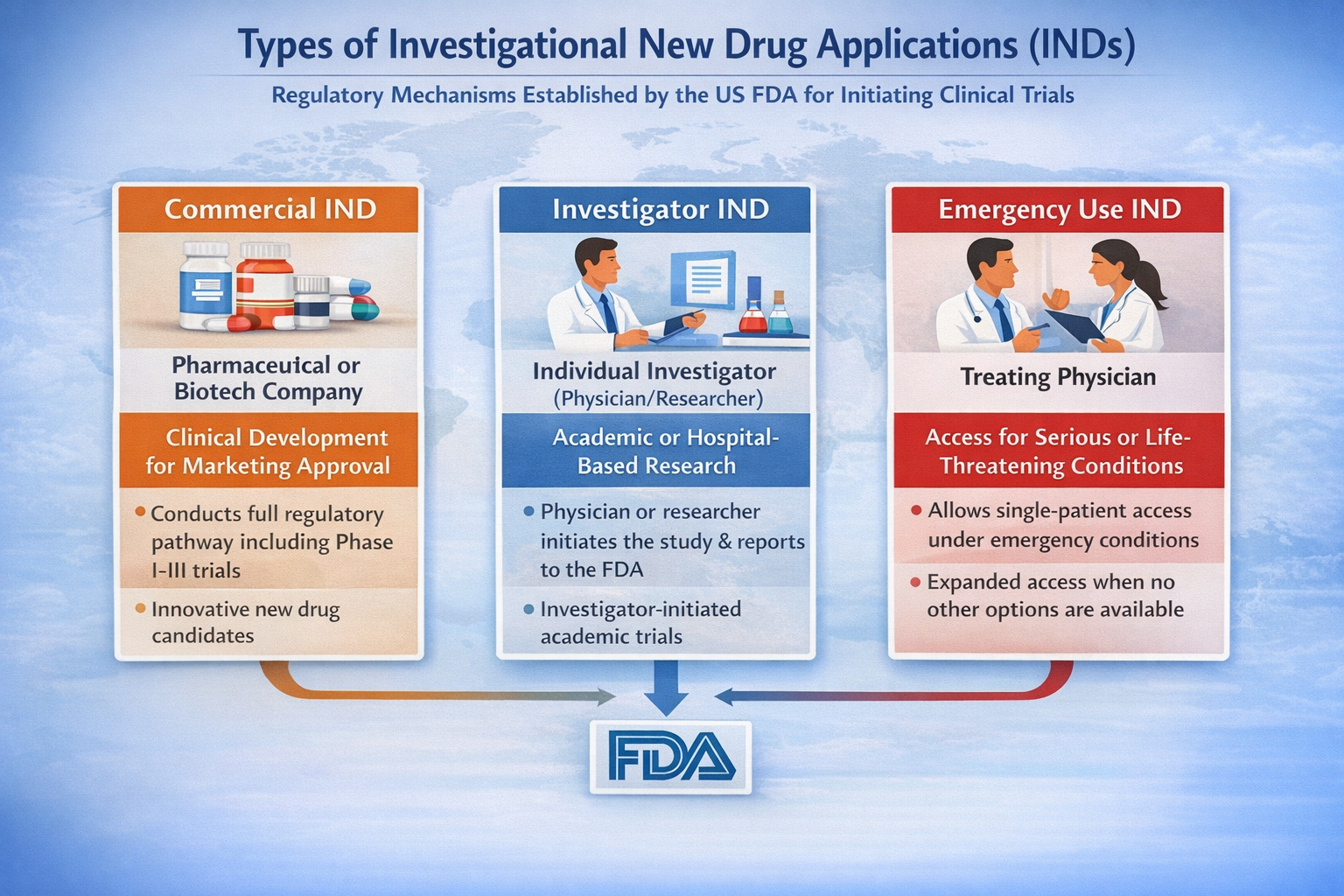 | Investigator IND | Individual Investigator (Physician/Researcher) | Conduct investigator-initiated research | Academic or institutional oversight | Hospital-based or academic clinical research |