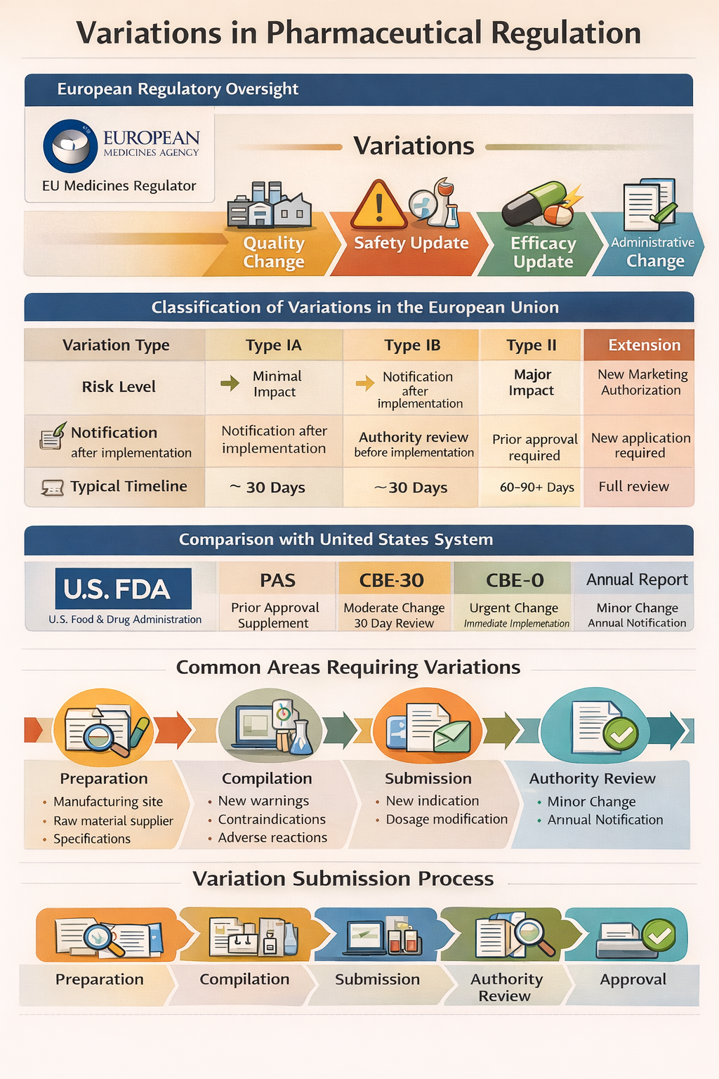 Variations are therefore a structured regulatory mechanism ensuring that any post-approval change maintains product quality, safety, and efficacy while preserving regulatory compliance throughout the product lifecycle.